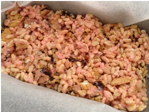 Slightly grease hands and push mixture into prepared tin until neat (the marshmallow may stick to your hands a little)- Refrigerate for 15 minutes