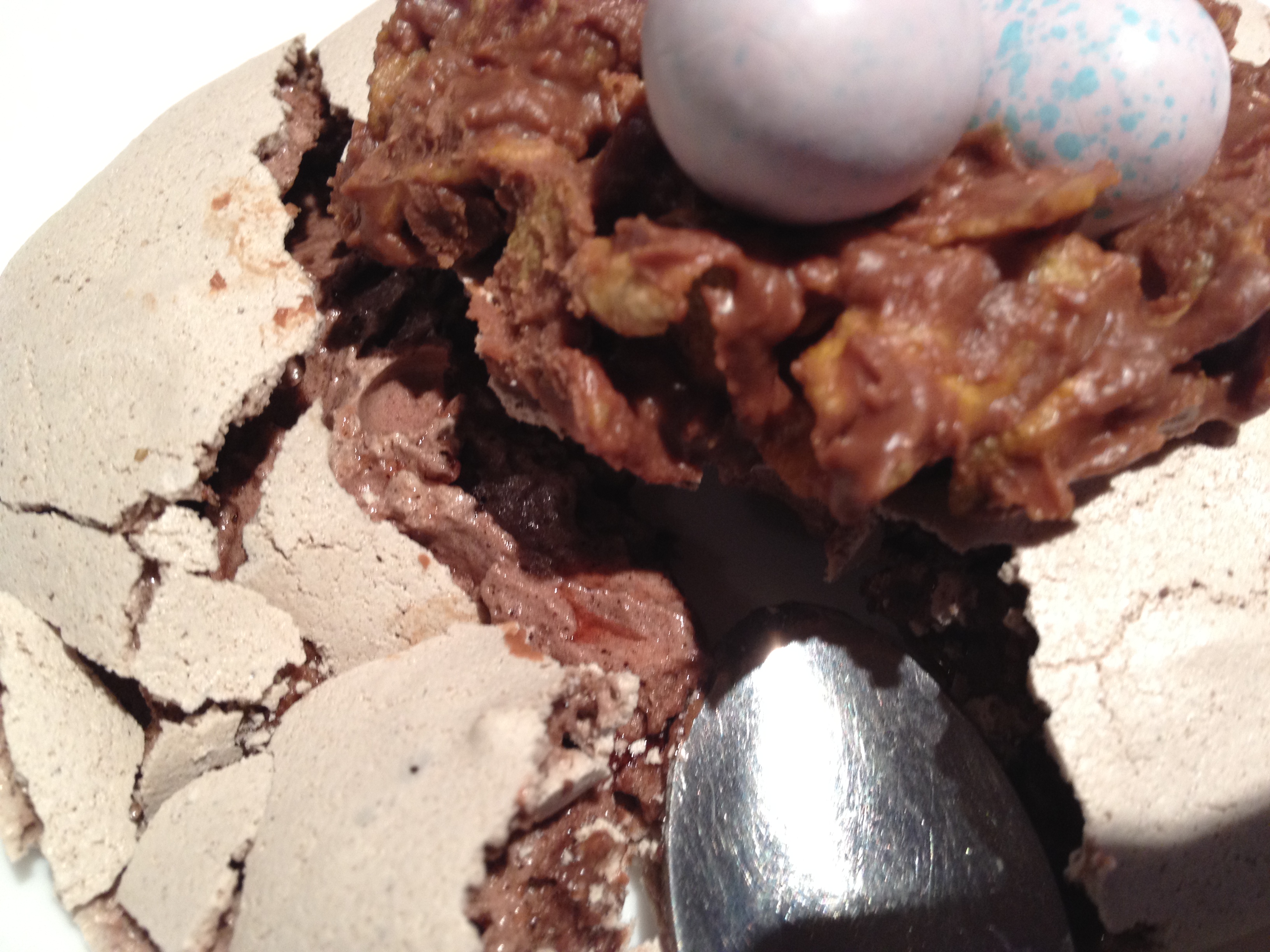 A soft, cracking, melt-in-mouth CHOCOLATE flavoured meringue ‘bowl’ so to speak, with a double melted chocolate cereal nest filling, topped with chocolate birds eggs and served with a side of pretty presentation 😀