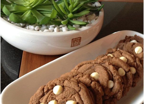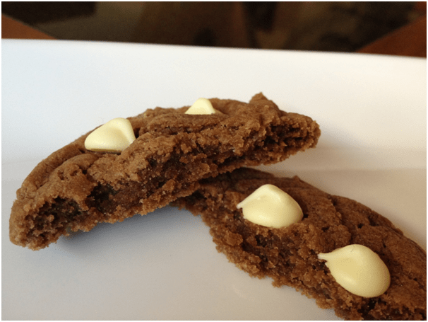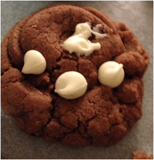 - While cooling on tray, quickly press in white chocolate chips on top, as many as desire per cookie