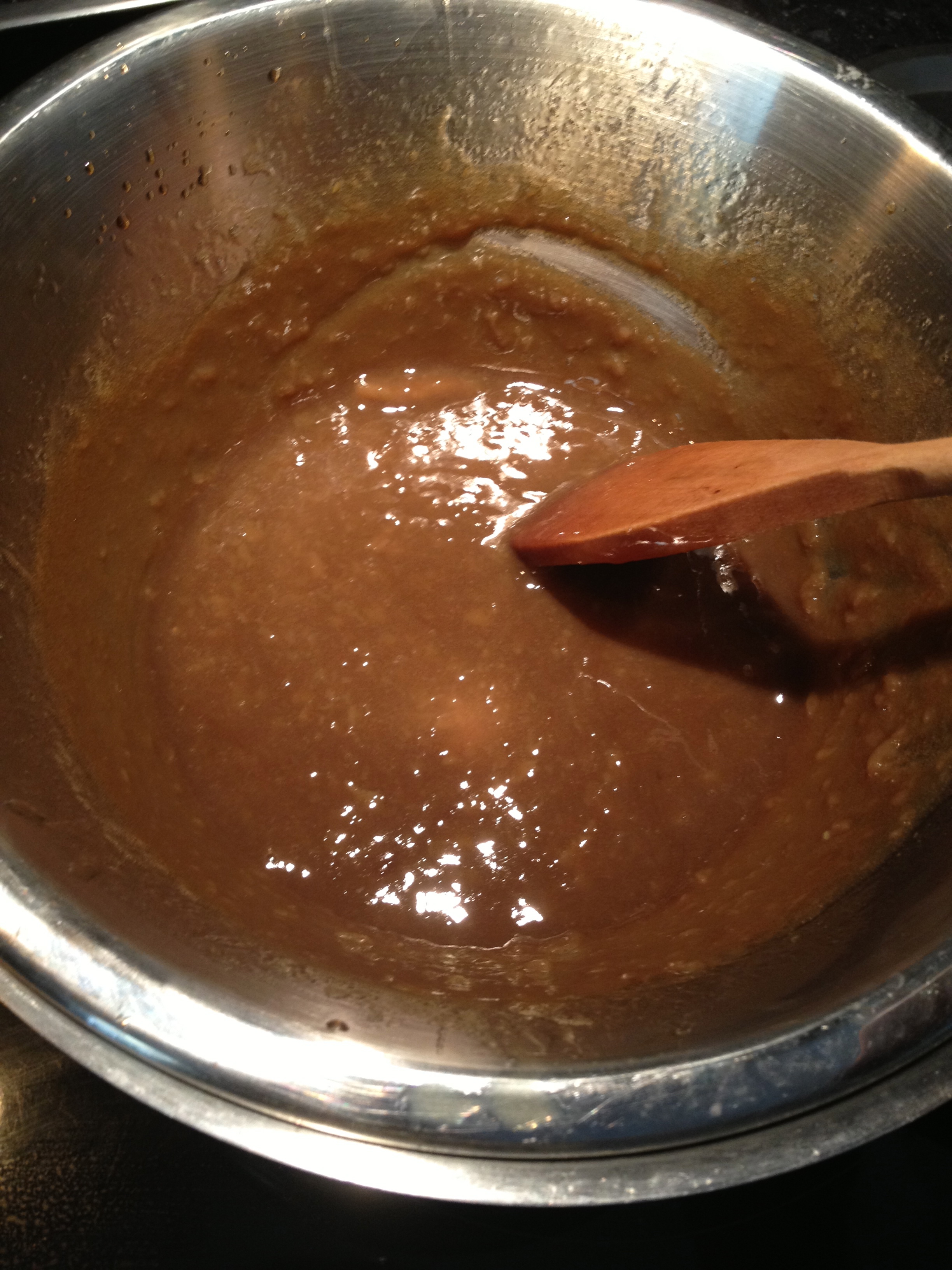 - Rigorously stir through milk and essence until the jelly-ishness is fully dissolved and the mixture is a tan colour