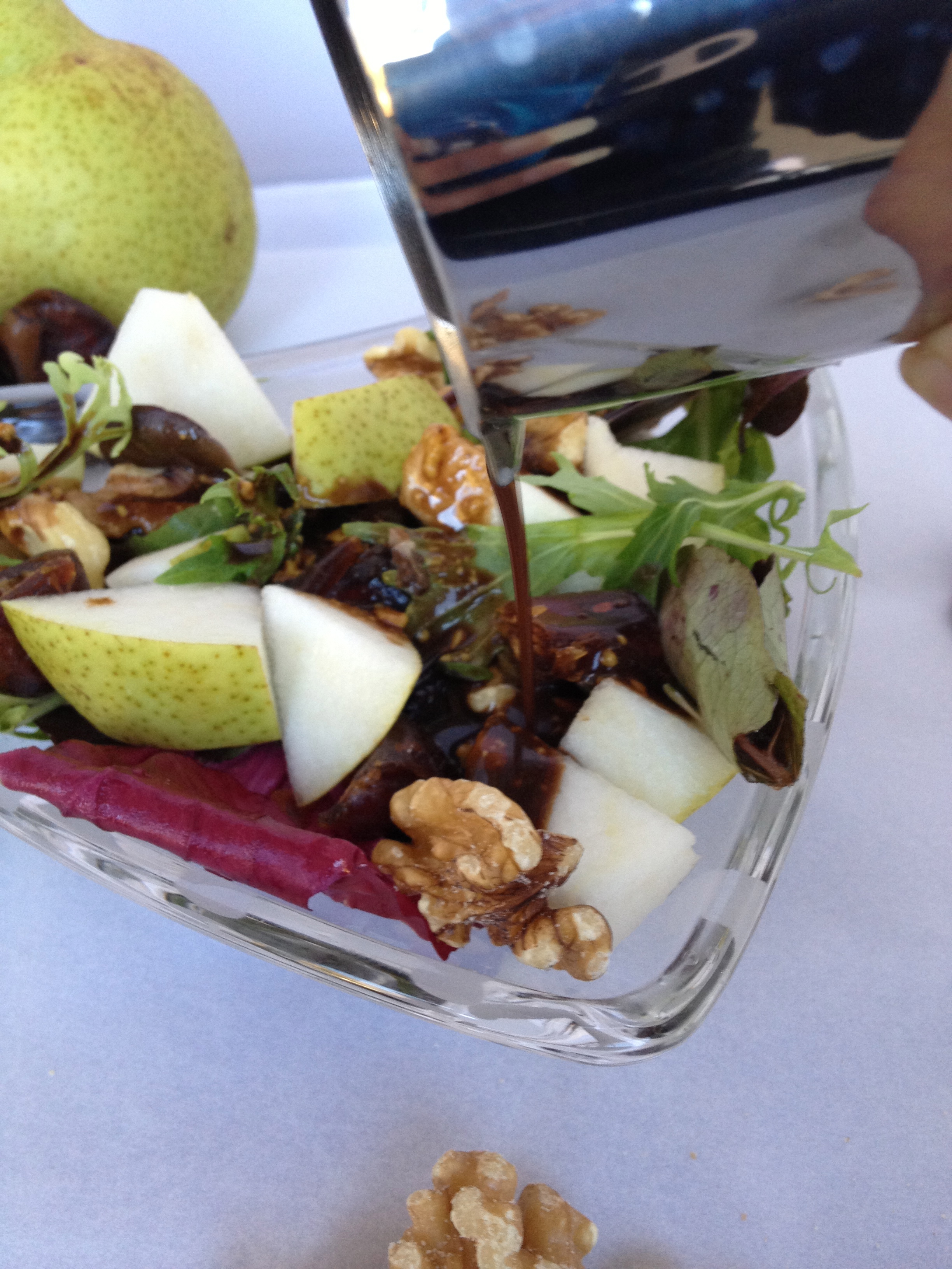 There was something so mouthwatering about the tang of the balsamic vinegar, the slight heat from the mustard mingling with the sweetness of the pears. And then when you got a date, it was always a surprise in the mouth, considering the pieces were hidden by the leafy greens.