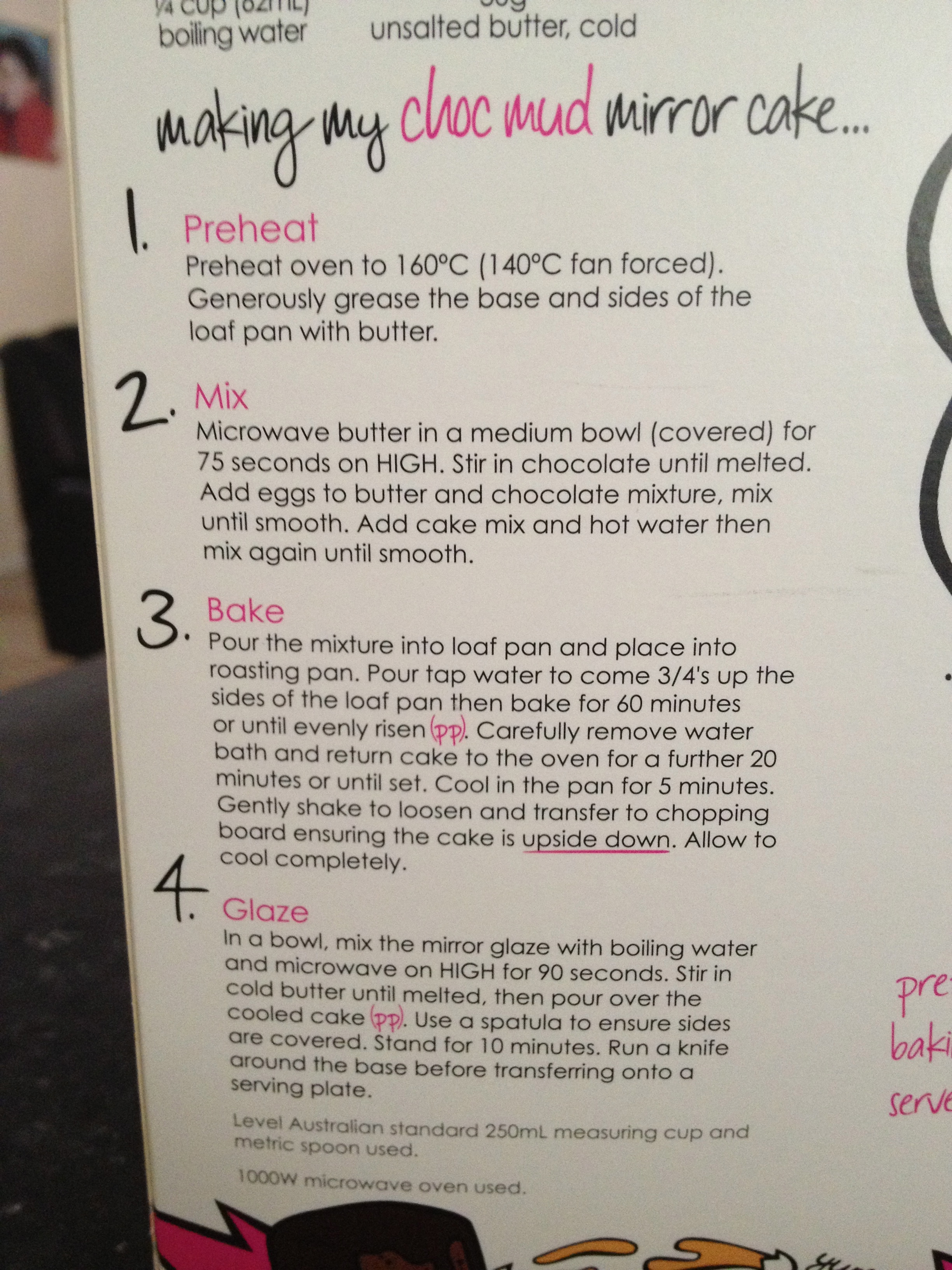 - This is also quite direct in its timing for baking – while I guess this is good to give a novice certainty, it does not accommodate for idea that people’s ovens are all different – for instance, of course the first 60 minutes of baking are fine but my cake was baked 10 minutes after instead of the 20 minutes suggested on the box – writing ’10-20 minutes’ and giving specific instructions as to how to check the cake is down (skewer inserted brings out few crumbs, lightly press down on cake and it should spring up) may have been a better idea