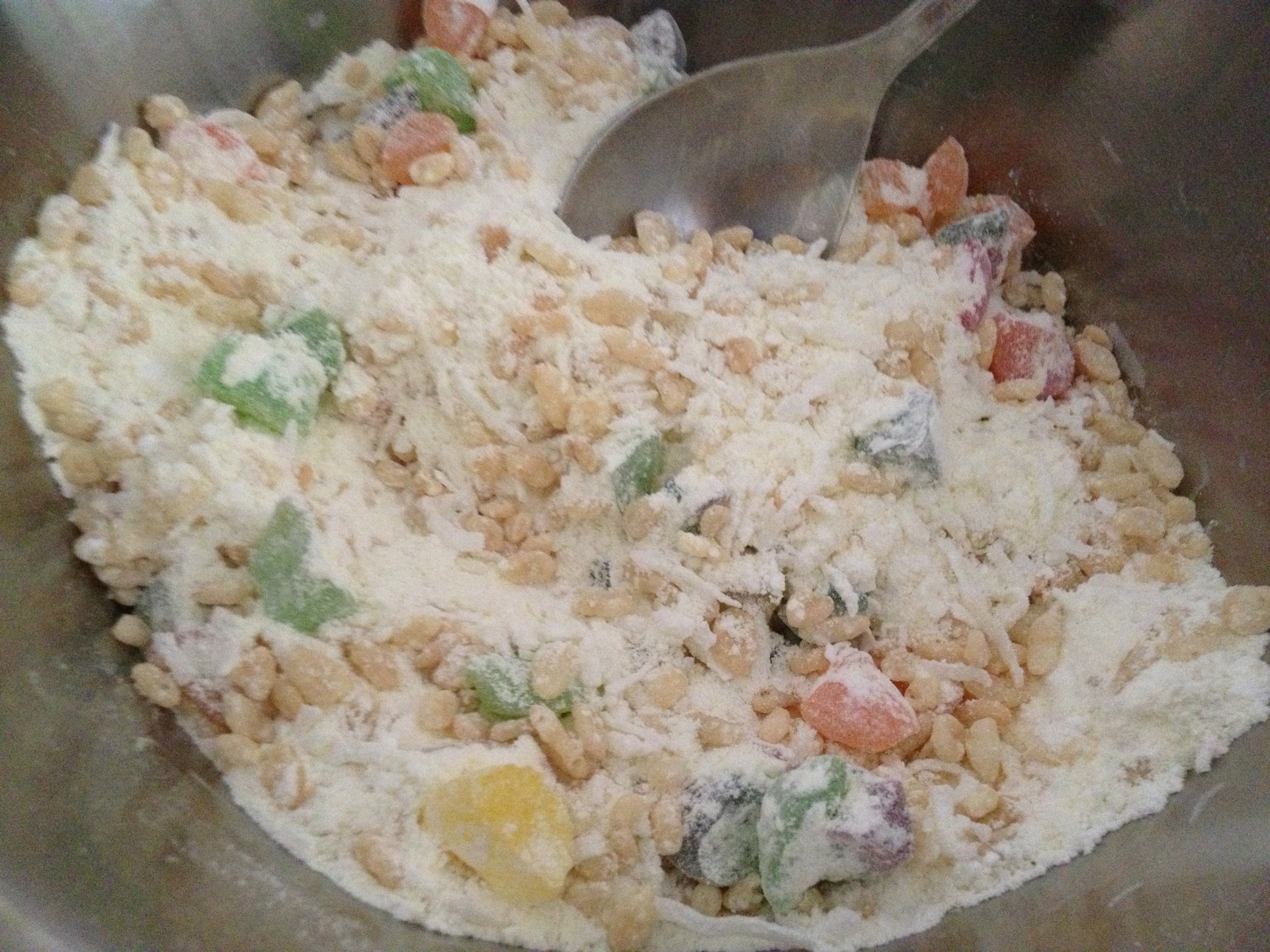 - Sift icing mixture into a large bowl and add in the chopped lollies, milk powder and rice bubbles