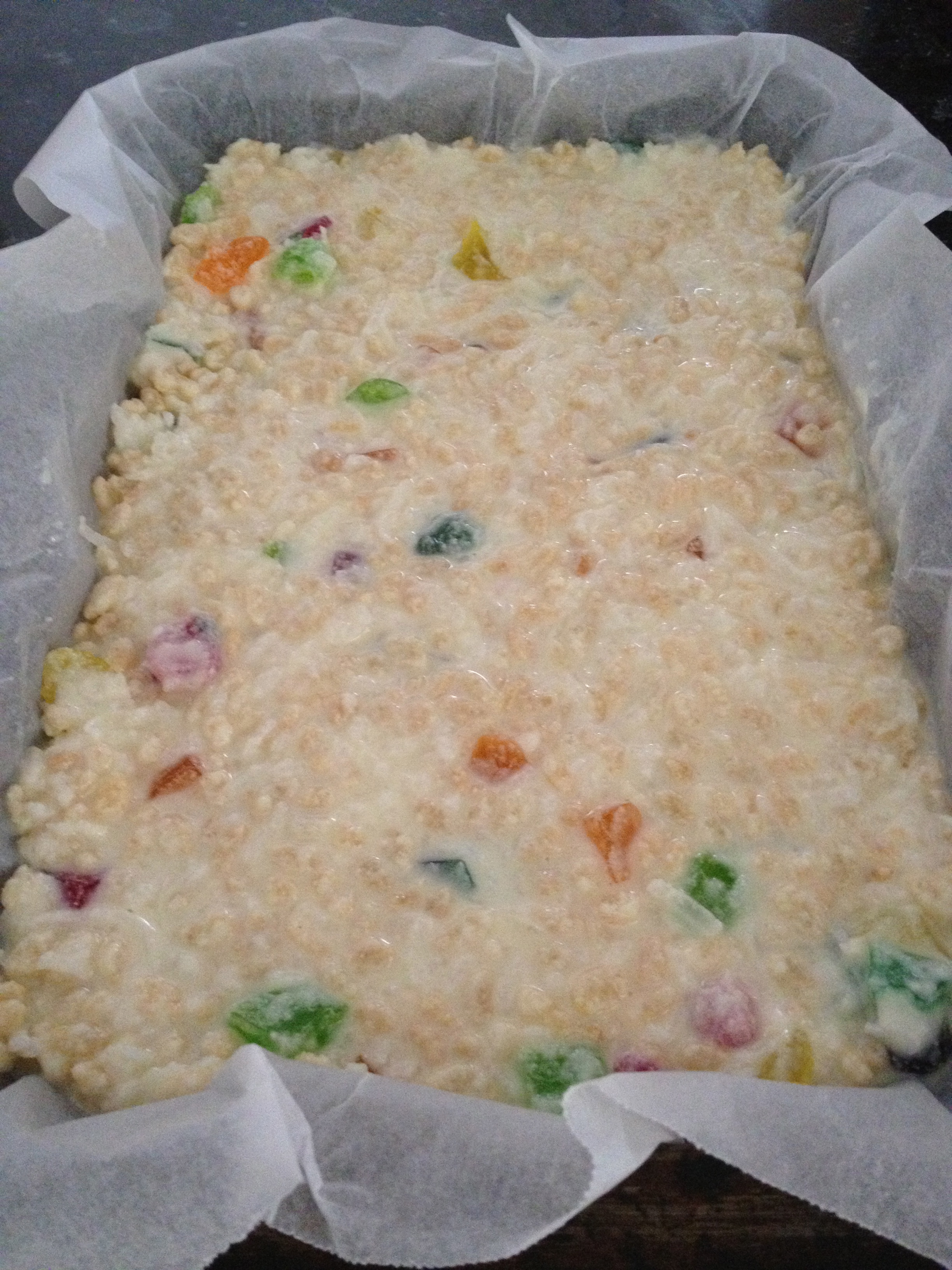 Also, the original recipe called for glace cherries, sultanas and candied angelica (wth right?) – Being a child in the body of an 18 year old, I just tutted and substituted chopped up lollies. It may send your kids on a high like it did me, but trust me – no one needs to be eating fancy-pants dried fruit in a slice as decadent as this one 😀