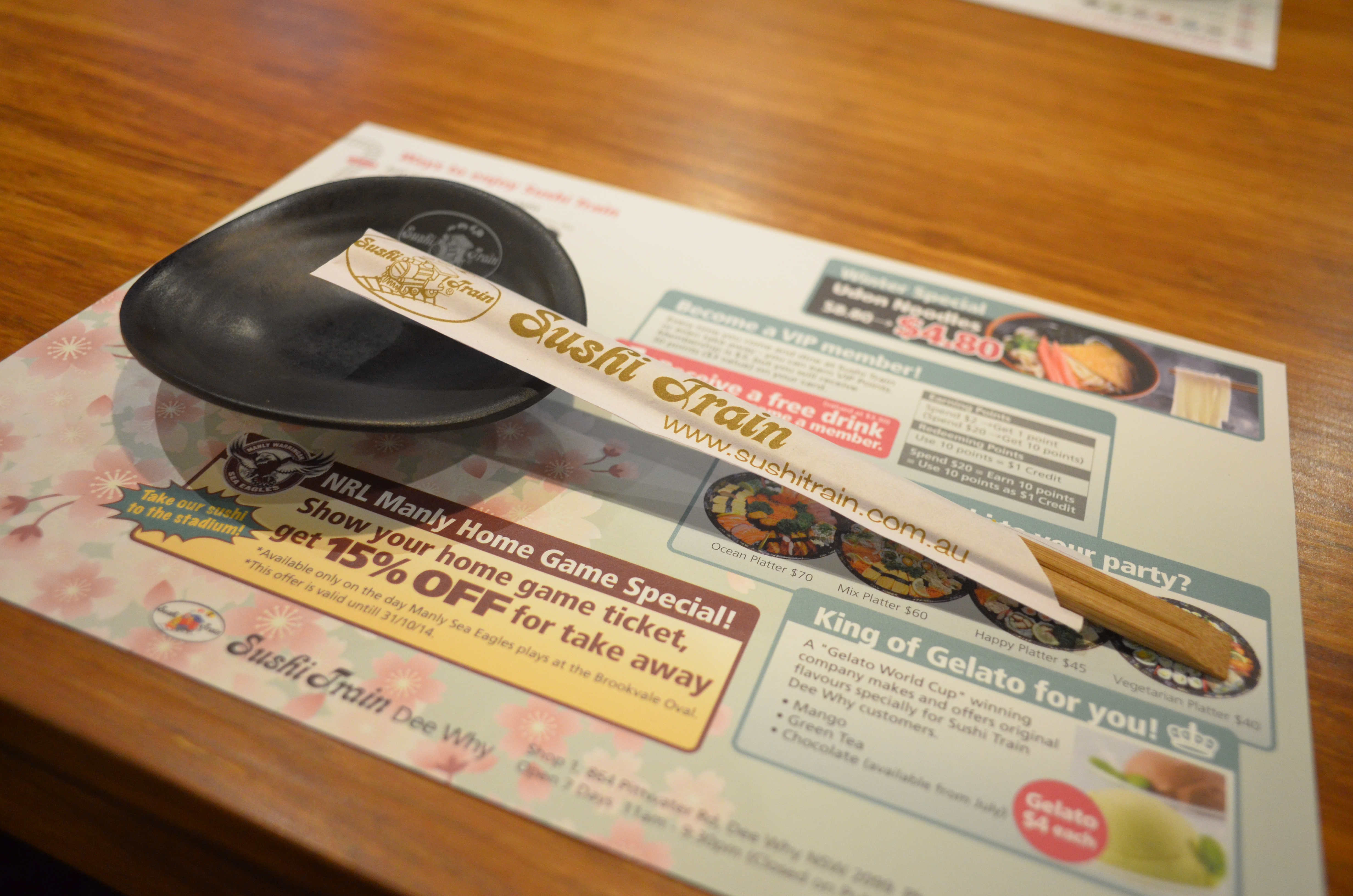 On arrival, my brother and I (since he is the only other person in my family with a love for sushi), were greeted by a really friendly staff, who directed us to our booth. There was soy sauce and a menu waiting, along with chopsticks and a make-shift, place-mat, and our server explained that this particular branch of Sushi Train, which is actually Australia wide, still has an pending liquor licence.