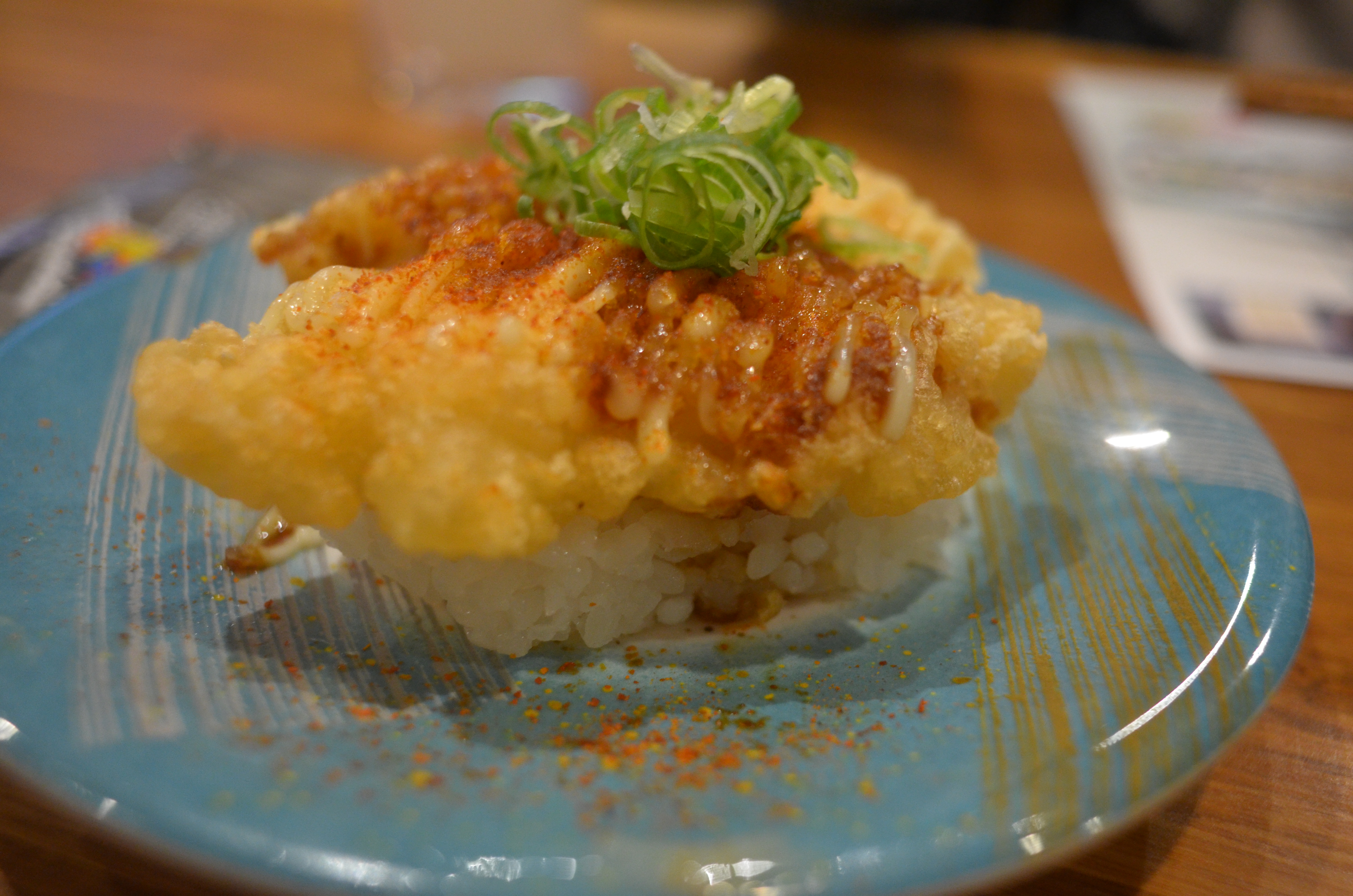 After this, I went a little snap-crazy and forgot about actually eating, while my brother helped himself to many an exotic roll off the train. He first started with some prawn, specifically, the Ebi Katsu Nigiri Prawn ($4.00). Topped with what looked similar to scrambled egg, this was scarfed up pretty quickly, in fact, I was lucky to get some photos without losing my hand!
