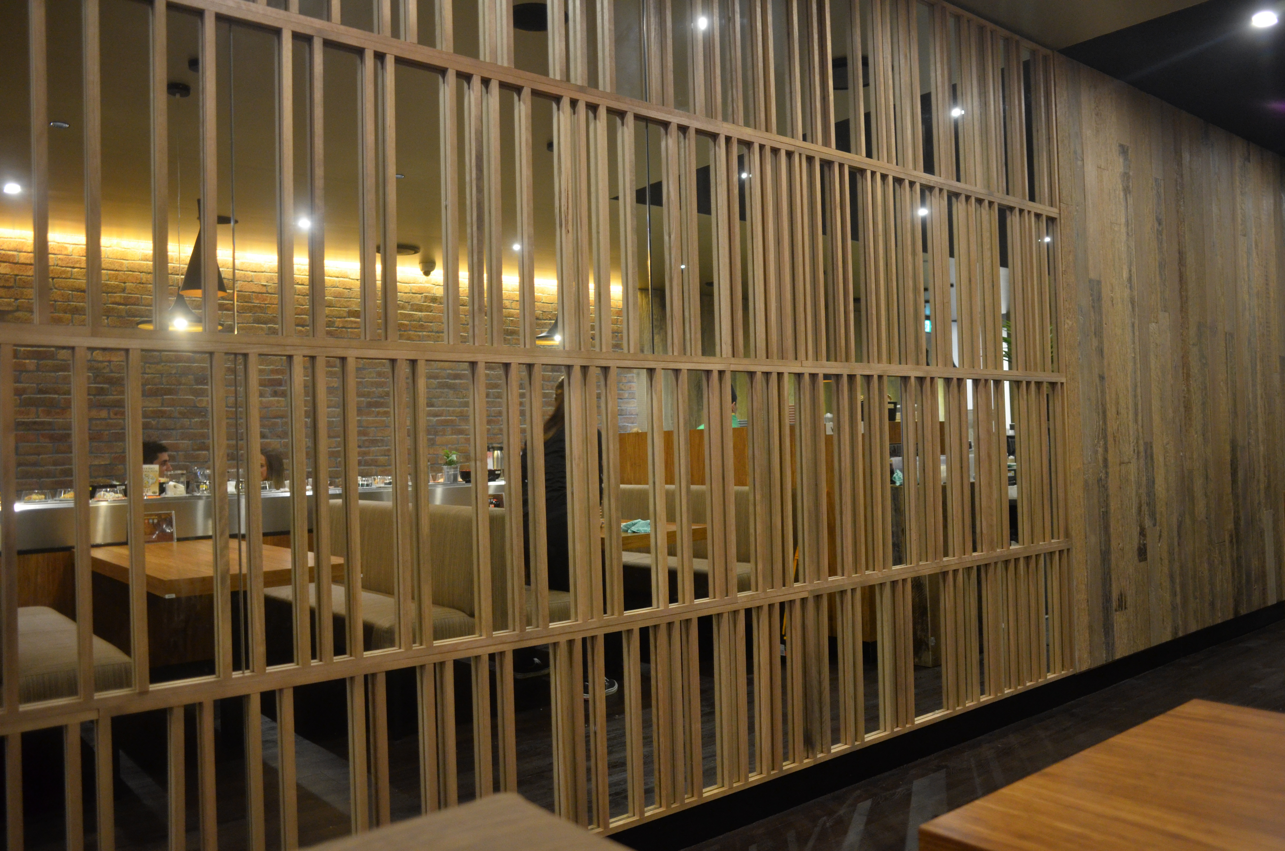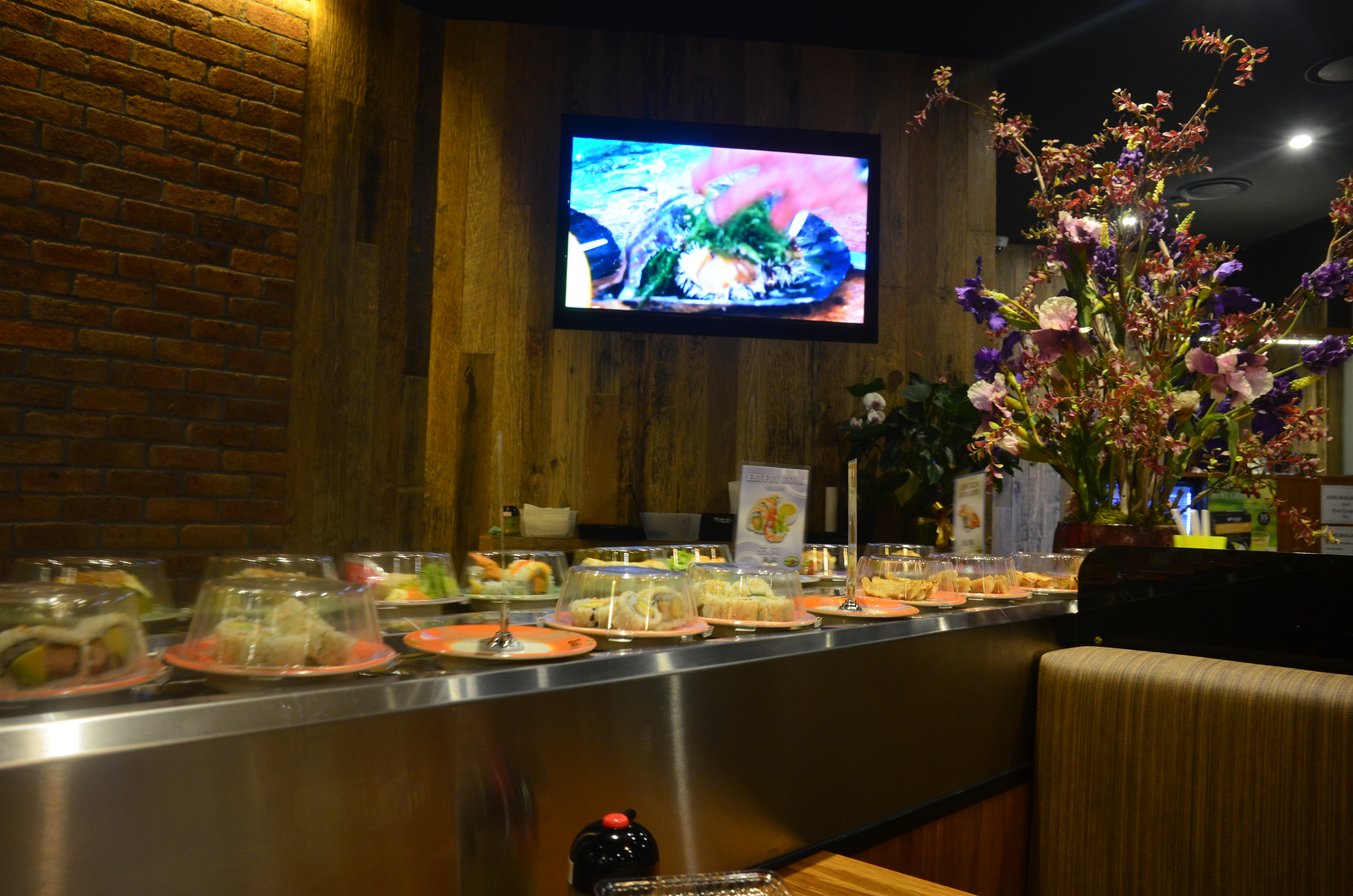 On walking in, it looked very contemporary but oriental at the same time. Japanese influence without outwardly displaying the flag 🙂 With bright lights surrounding the mahogany tables and tan walls, it really set off the train of dishes circulating around. I liked how it looked fancy, but still simple, a mix of booths and counter chairs leading to the kitchens, where you could see the chefs preparing meals!
