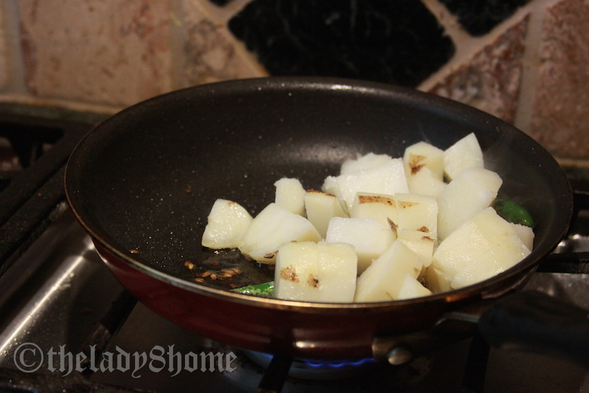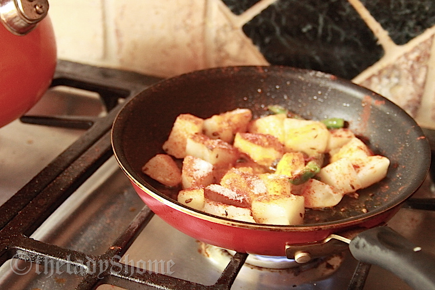 - Fry them on medium heat for 7-8 minutes, stirring frequently to prevent them from stick to the bottom of the pan. The potatoes will start browning, and losing shape a bit. That’s perfectly OK. Make sure they don’t get mashed though.